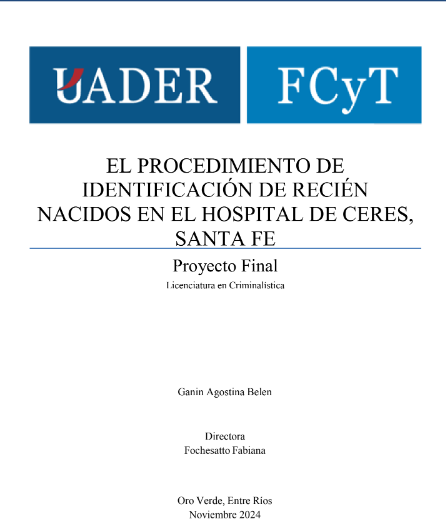 El presente trabajo de investigación analiza la eficacia del procedimiento de identificación de recién nacidos en el Hospital de Ceres, Santa Fe, durante los años 2018 y 2021, con el objetivo de evaluar su capacidad para garantizar el derecho a la identidad y prevenir negligencias o delitos como la sustracción de menores. El estudio se enfoca en las impresiones pelmatoscópicas artificiales tomadas a los recién nacidos, así como en los métodos utilizados para vincularlos con su madre, considerando los estándares establecidos por la Ley Nacional N° 24.540. La propuesta metodológica de ésta investigación es de carácter cualitativo y descriptivo, con un enfoque longitudinal que abarca dos años. Se analizaron en total 160 fichas identificatorias seleccionadas aleatoriamente, complementadas con entrevistas al personal hospitalario encargado de realizar la identificación neonatal. Este enfoque busca describir el procedimiento actual desde la observación, evaluando el cumplimiento de los pasos pre establecidos por la normativa vigente, las técnicas y materiales utilizados. Este trabajo permitirá no solo indagar la idoneidad del procedimiento, sino también proponer mejoras que garanticen la correcta identidad del binomio madre-hijo y fortalezcan el sistema de identificación neonatal.