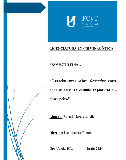 Los delitos informáticos son aquellos que se dan por medios informáticos, el Grooming es un ciberdelito presente en el Art. 131 del CPN, se da cuando una persona mediante un recurso digital atenta contra la integridad sexual de un menor; los niños, niñas y adolescentes (NNyA) viven en un entorno digital por lo que se encuentran en riesgo constante. A raíz de esto, se plantea como objetivo general “explorar los conocimientos que poseen los adolescentes de primero a sexto año que asisten a la Escuela Secundaria N.o 10 “Norma Bouvet de D ́ Alessandro” de Villaguay en el periodo lectivo 2022 sobre el delito de grooming”, teniendo como muestra 170 adolescentes entre 12 y 17 años, la investigación presenta enfoque cuantitativo de alcance exploratorio-descriptivo, siendo un estudio transversal ambispectivo; para la recolección de datos se empleó una encuesta anónima como instrumento, con cuestionario de preguntas cerradas; para analizar datos primeramente se utilizó Excel, un editor de hojas de datos, y luego un software estadístico (IBM SPSS Statistics). Como resultado se obtuvo que el 68% de adolescentes identifica gráficamente este delito y menos del 50% sabe la definición de Grooming, aun así, el 54% afirmó que desde la escuela brindaron información al respecto, casi el 50% tiene la información necesaria prevenir este ciberdelito; por lo tanto, es nuestro deber como individuos de sociedad y como criminalistas tener la capacidad de informar y prevenir acerca de Grooming a los NNyA y a la comunidad en general.