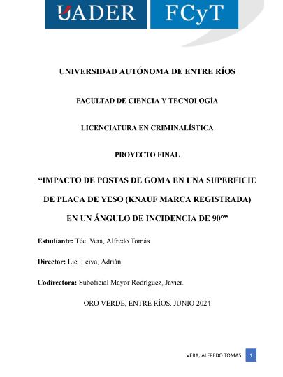 El proyecto de investigación se centró en el estudio sobre el impacto de las postas de goma en la superficie de yeso (Knauf marca registrada). El propósito de esta fue responder a los interrogantes de cuál será la distancia máxima que los proyectiles antitumulto logran atravesar la superficie de yeso y las características que permanecen sobre el plano balístico.