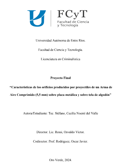 Considerando que las armas de aire comprimido son de fácil acceso por la poca reglamentación que existe sobre ellas, siendo utilizadas en algunos casos para cometer hechos delictivos, es importante que los peritos balísticos conozcan las características que dejan sus proyectiles en el blanco para identificar su procedencia y arribar a conclusiones categóricas. Por ello, el objetivo del presente estudio es analizar características de los orificios producidos por proyectiles de un arma de Aire Comprimido (5,5 mm) sobre una placa metálica y sobre un trozo de tela de algodón Jersey. La investigación presenta un enfoque cuantitativo, con un alcance descriptivo y un diseño cuasiexperimental con una muestra conformada por orificios originados por proyectiles, disparados por un arma de aire comprimido (5,5mm) sobre 100 trozos de tela de algodón y 100 placas de acero con técnica de muestreo no probabilística y como instrumento las tablas de análisis de datos en las que se consideraron las siguientes variables: perforación, forma, dimensiones, desprendimiento, bordes y enjugamiento de los orificios y la profundidad. El análisis de la experiencia concluyó que: los proyectiles perforaron los blancos de tela pudiendo considerar que la morfología predominante de los orificios es la rectangular y estrellada, las dimensiones no varían mucho según la distancia de disparo, los bordes son indefinidos, el desprendimiento es parcial, dando como negativa la variable de enjugamiento. En cambio, en los blancos de acero los proyectiles no fueron capaces de perforarlos (originando impactos) evidenciándose la variable enjugamiento y la de profundidad.