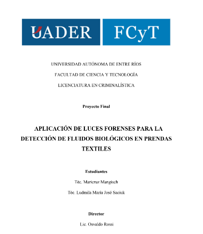 Este proyecto analiza y describe el comportamiento de fluidos biológicos depositados en prendas textiles de diferentes texturas y tonalidades al exponerse bajo las luces y filtros que presenta el Ilumi-Naty, equipo utilizado para llevar a cabo dicho estudio.